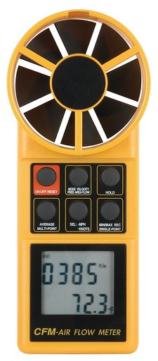 Specifications: Air Velocity Range: 80 to 6900 fpm; 0.4 to 35 m/s; 0.9 to 78 mph; 1.4 to 108 kph; 0.8 to 68 knots Resolution: 1 fpm; 0.01 m/s; 0.1 mph; 0.1 kph; 0.1 knot Accuracy: ±2% of full scale Temperature Range: 14 to 122°F (-10 to 50°C) Accuracy: ±0.6°C Resolution: 0.1°F/°C Accuracy: ±2°F/±1°C Power Supply: Single 9V battery Dimensions: 181 x 76 x 45mm Weight: 210g