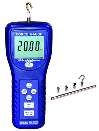 Specifications: Measuring Capacity: 20.00 kg / 44.10 lb / 196.12 N Resolution: 0.01 kg / 0.01 lb / 0.02 N Accuracy: ±(5% + 2 dgt.) Full Scale Deflection: 0.1mm max. Sampling Time: Normal: 1 second to 8 hours; Peak hold: 10 to 500 ms Memory Card: SD memory card, 1 GB to 16 GB Data Output: USB/RS232 PC computer interface Power Supply: 6 x 1.5V UM3/AA batteries Dimensions: 215 x 90 x 45mm (8.5 x 3.5 x 1.8”) Weight: 650 g (1.43 lb)